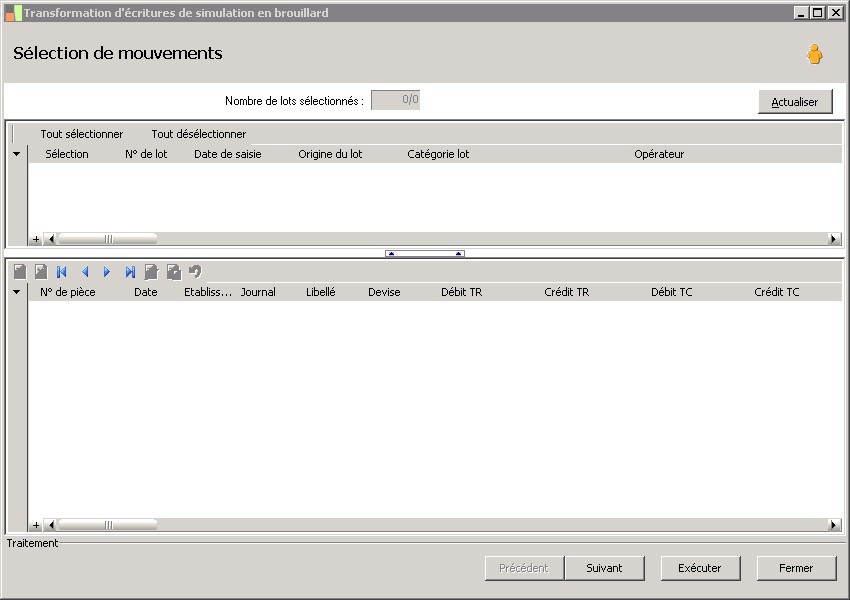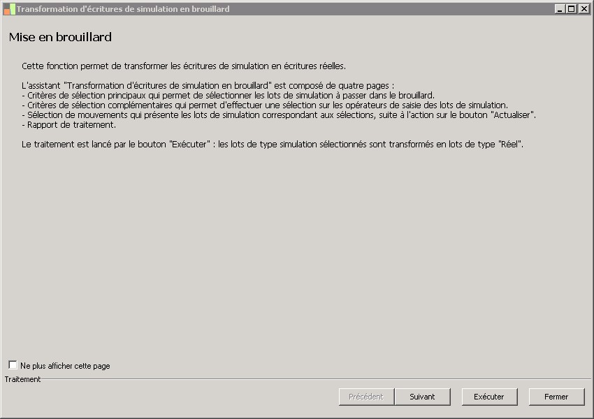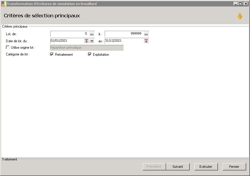 (Sage FRP 1000 Suite Financière) Menu Comptabilité > Générale > Traitements périodiques > Transformation d'écritures de simulation en brouillard