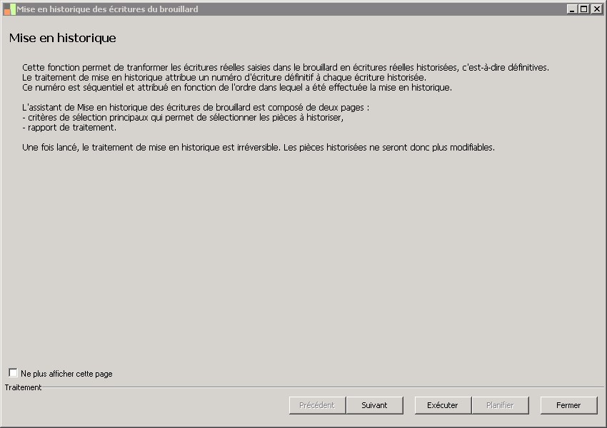 (Sage FRP 1000 Suite Financière) Menu Comptabilité > Générale > Traitements périodiques > Mise en historique des écritures du brouillard