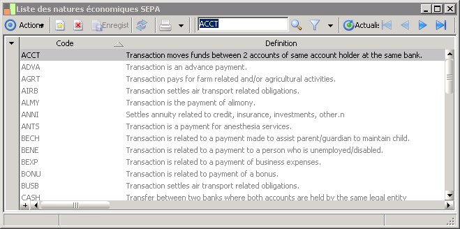 (Sage FRP 1000 Suite Financière) Menu Banque Paiement > Paramètres > Remises > Liste des natures économiques SEPA