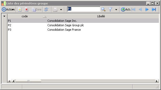 (Sage FRP 1000 Suite Financière) Menu Comptabilité > Paramètres > Société > Liste des périmètres groupe
