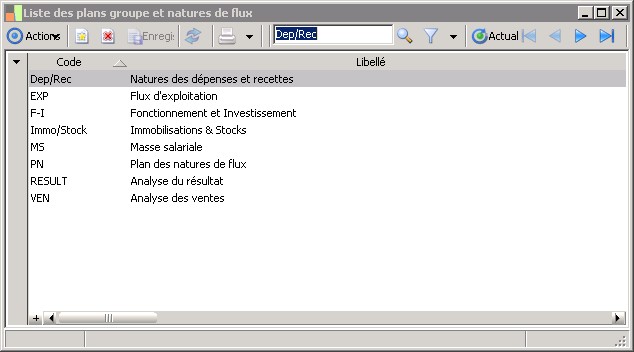 (Sage FRP 1000 Suite Financière) Menu Comptabilité > Paramètres > Comptabilité analytique > Liste des plans groupe et natures de flux
