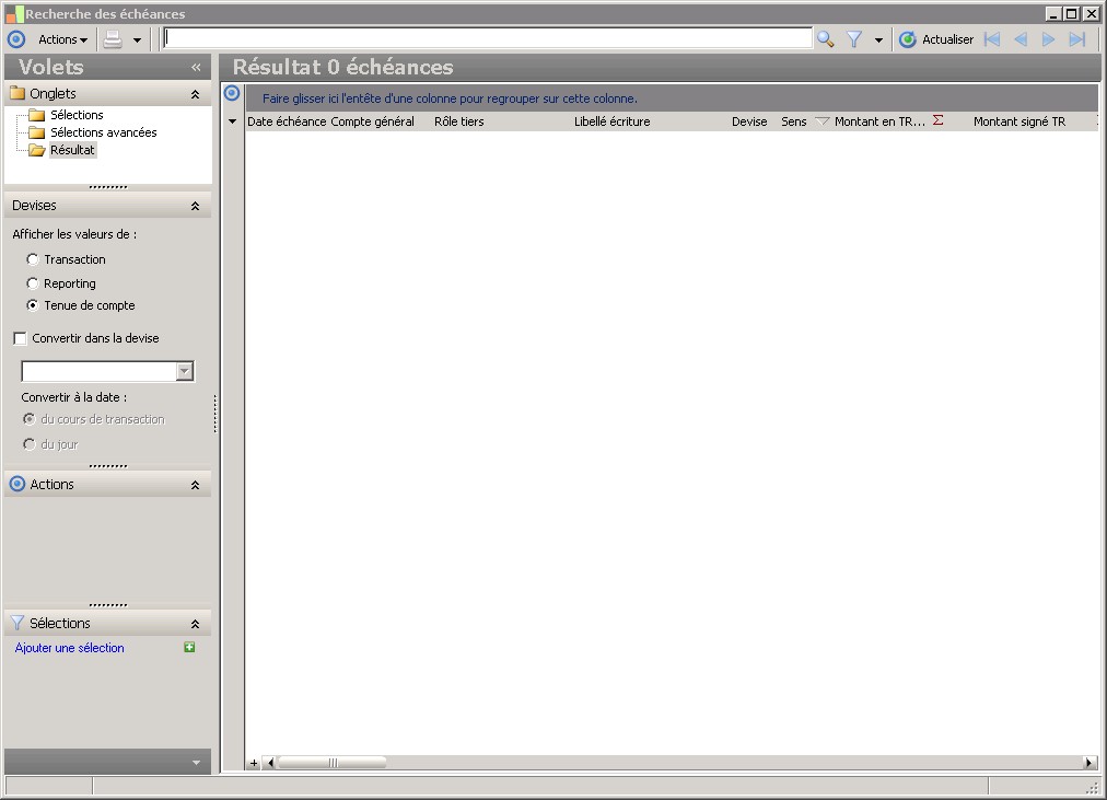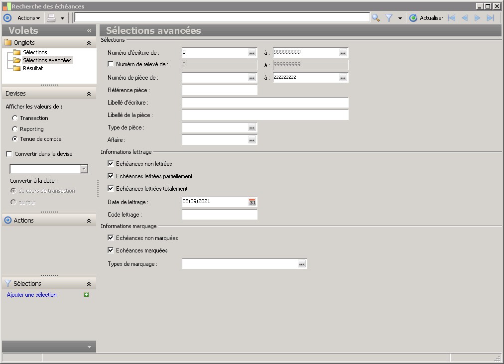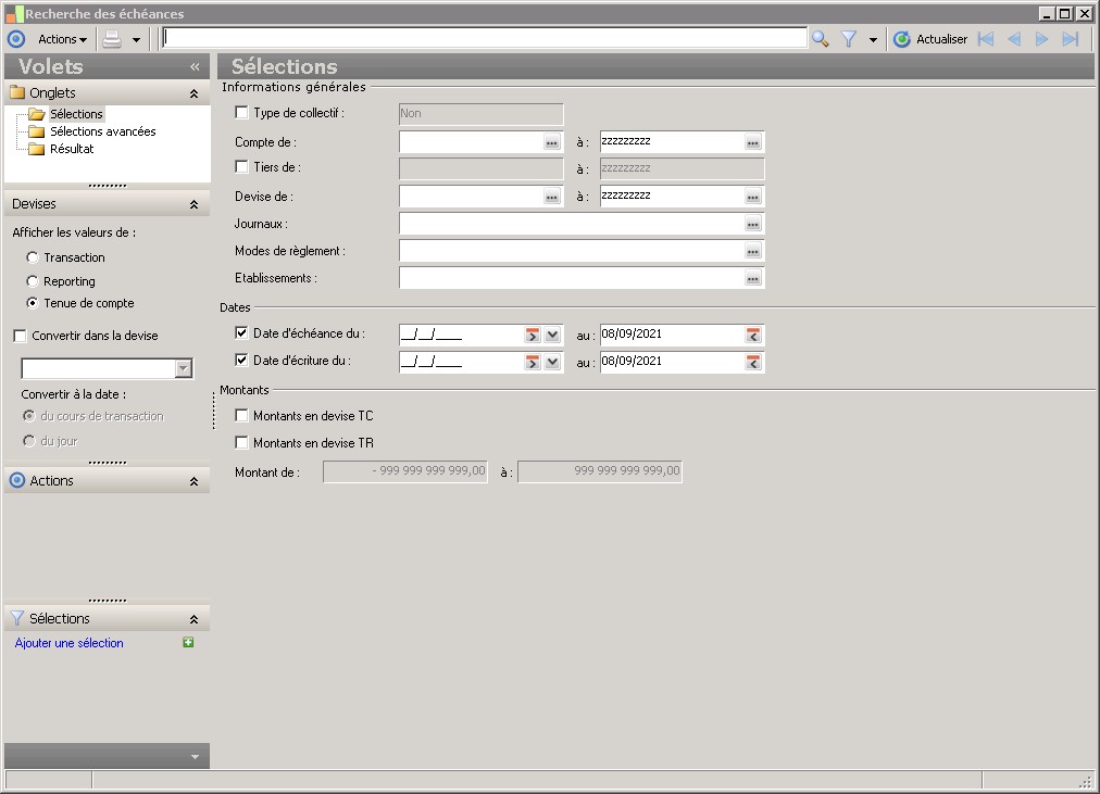(Sage FRP 1000 Suite Financière) Menu Comptabilité > Echéancier > Recherche des échéances