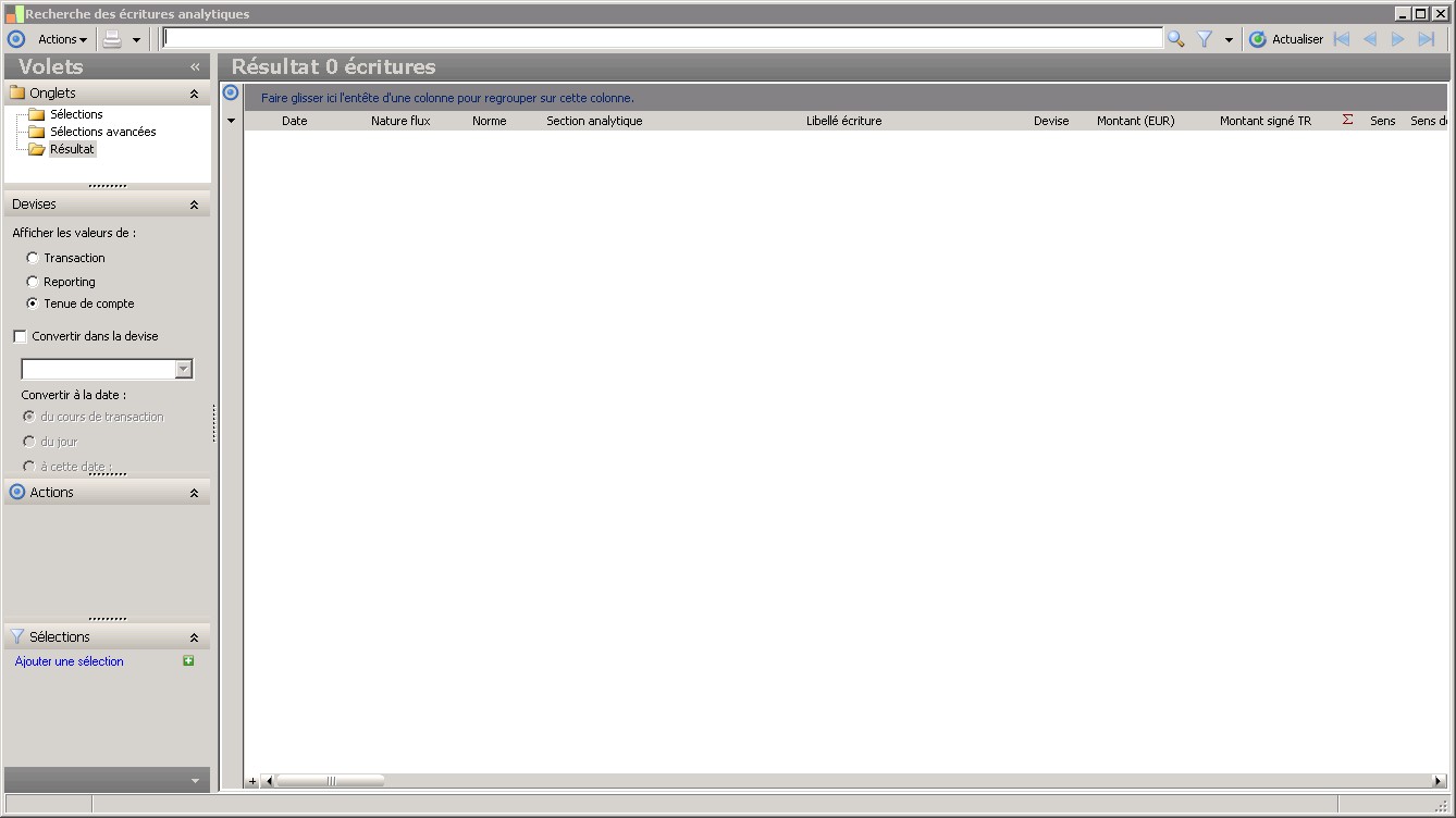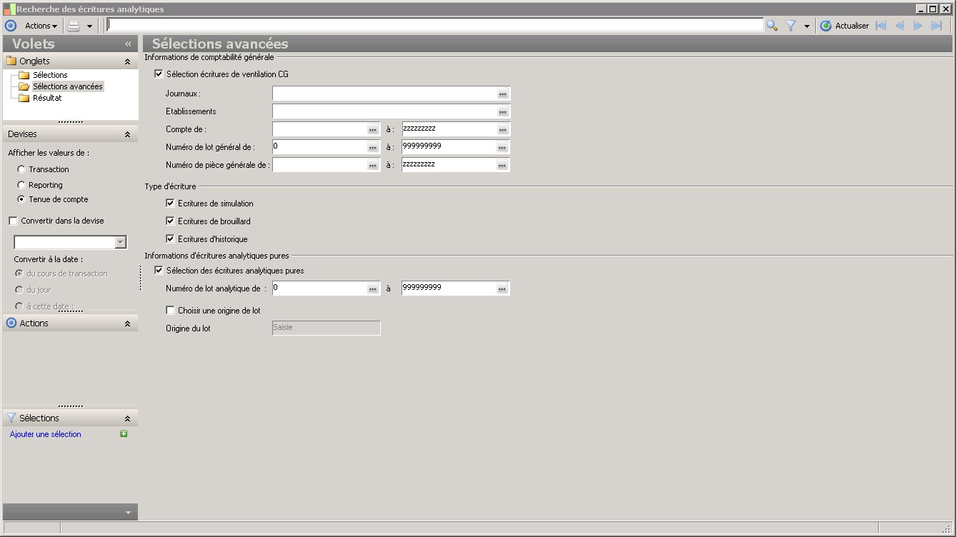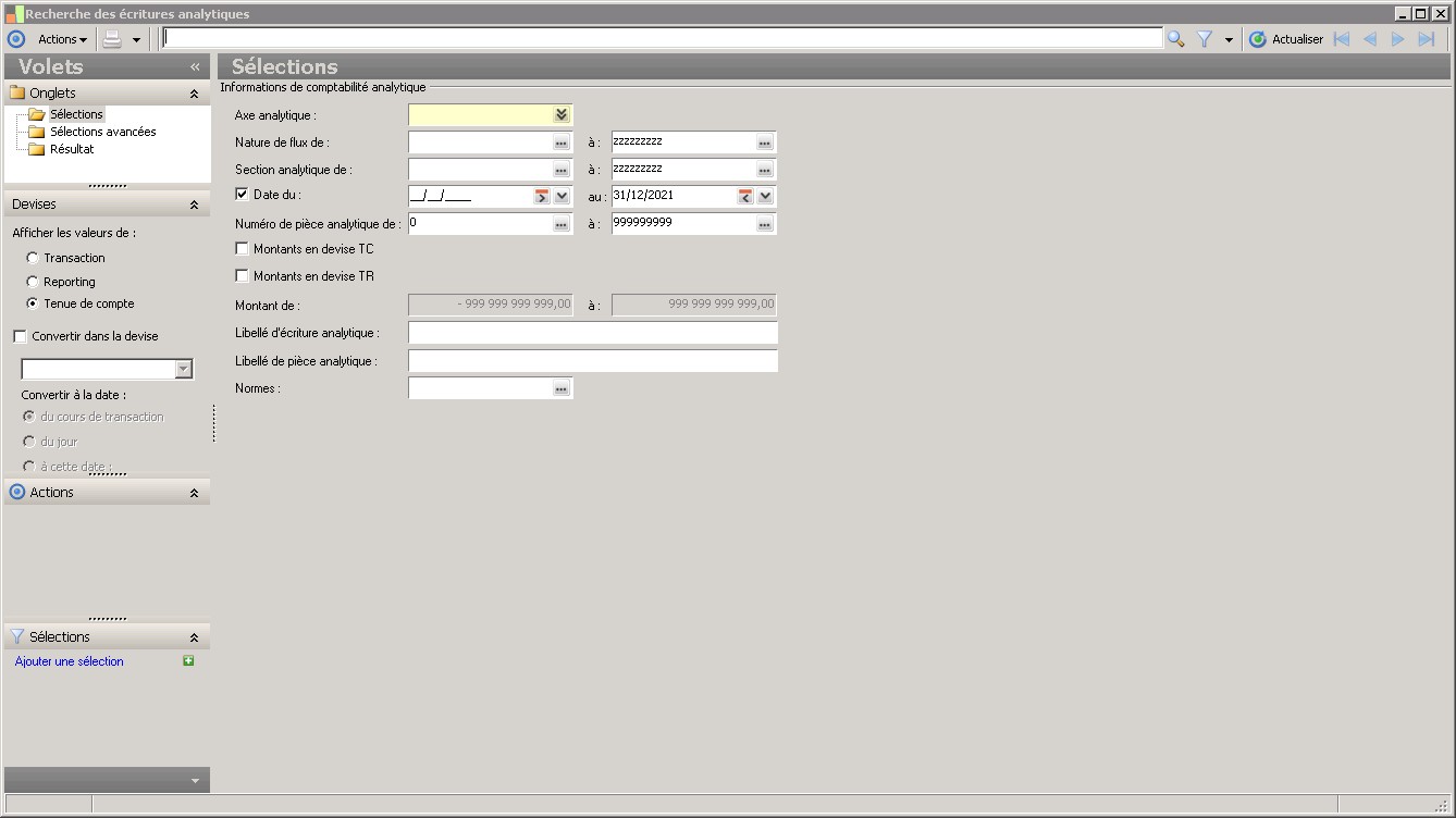 (Sage FRP 1000 Suite Financière) Menu Comptabilité > Analytique > Interrogations / Consultations > Recherche des écritures analytiques