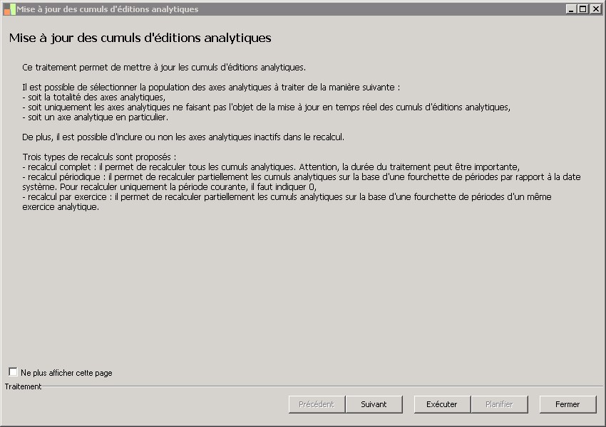 (Sage FRP 1000 Suite Financière) Menu Comptabilité > Initialisation > Analytique > Mise à jour des cumuls d'éditions analytiques
