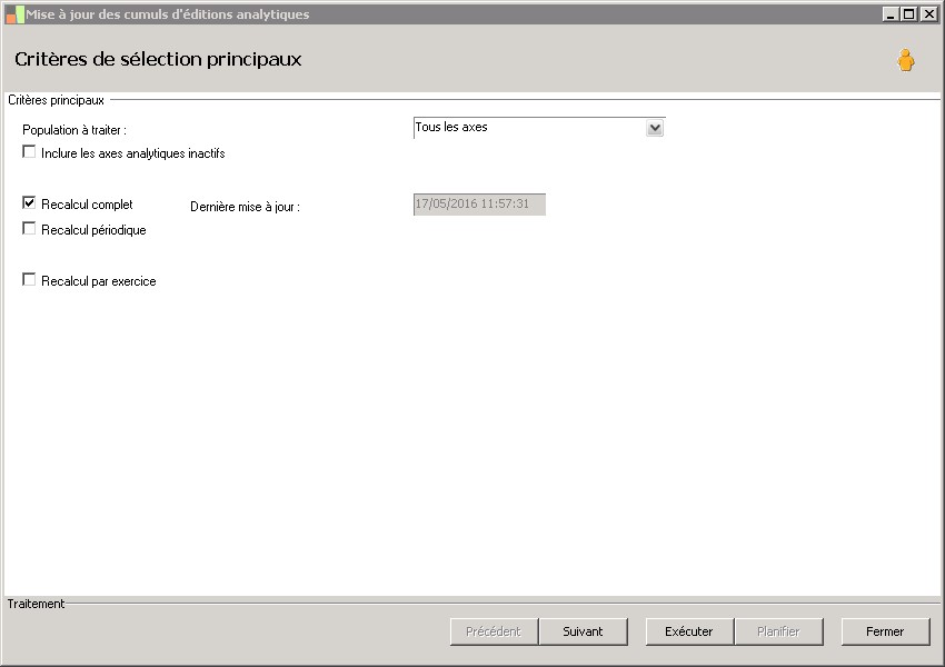 Paramètre permettant le choix d'un recalcul partiel de l'ensemble des cumuls analytiques à plat sur la base d'une sélection d'une fourchette de période d'un même exercice analytique. |