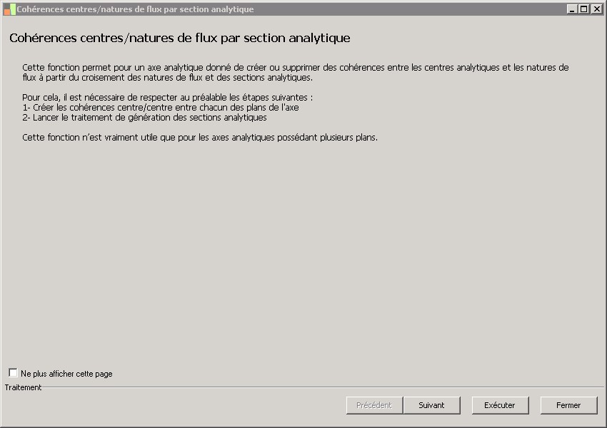 (Sage FRP 1000 Suite Financière) Menu Comptabilité > Paramètres > Comptabilité analytique > Cohérences centres/natures de flux par section analytique