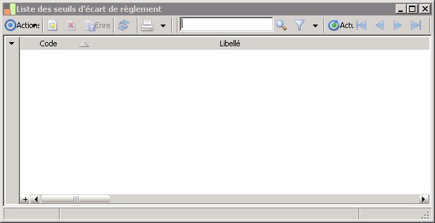 (Sage FRP 1000 Suite Financière) Menu Immobilisations > Paramètres > Comptabilité générale > Liste des seuils d'écart de règlement