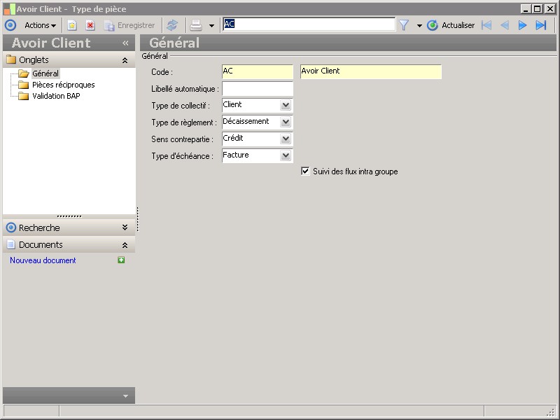 Si cette option est cochée pour un type de pièce donné, cela signifie que les flux intra groupe seront gérés.Ainsi, dès qu'une pièce ayant ce type de pièce sera passée sur un tiers société, la pièce sera considérée comme un flux intra groupe.Cette information n'est pas modifiable lorsque le type de pièce est associé à un type de pièce paramètre. |