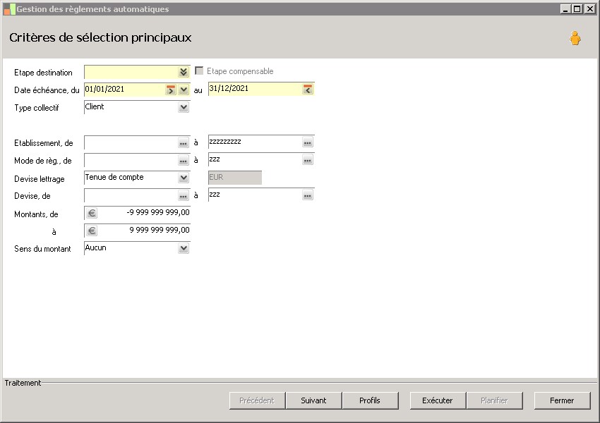 Borne inférieure de critère de sélection des échéances d'après leur date d'échéance. Cette date est initialisée par défaut au premier jour de l'exercice en cours. |
