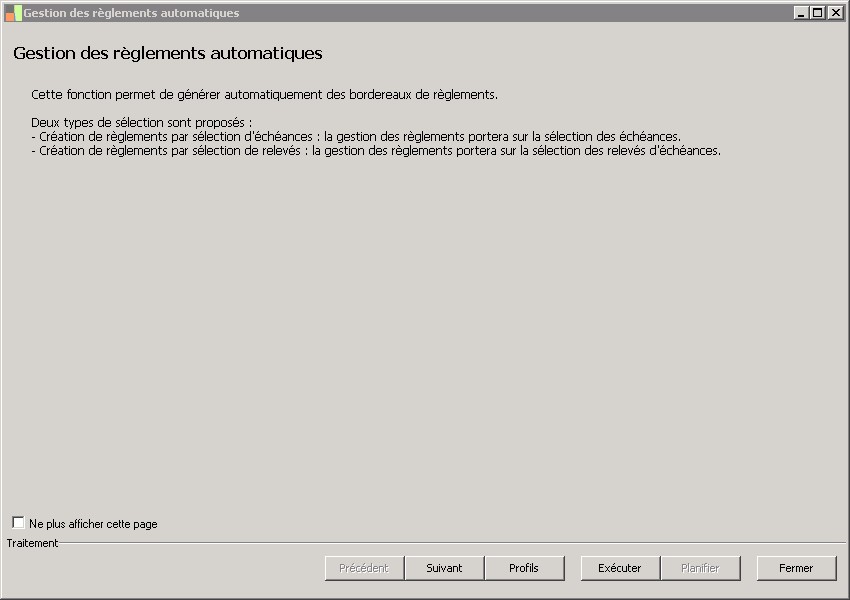(Sage FRP 1000 Suite Financière) Menu Comptabilité > Echéancier > Décaissements > Gestion des règlements automatiques