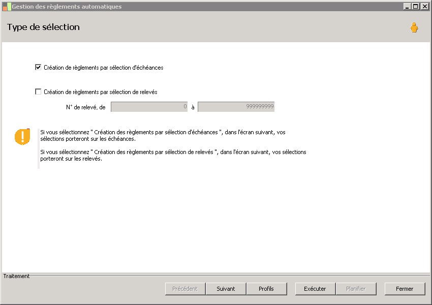 Indiquez si vous souhaitez oui ou non sélectioner des échéances pour constituer le bordereau.En effet, il est également possible de faire une sélection par relevé. |