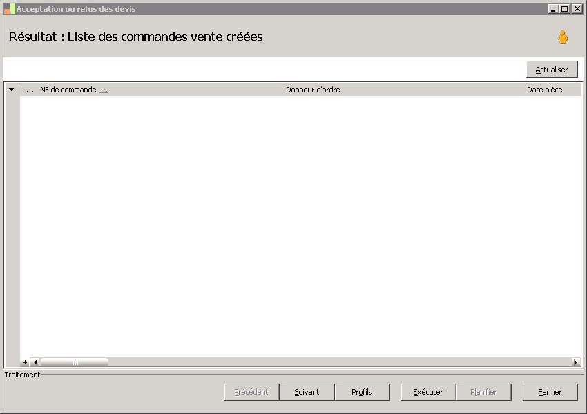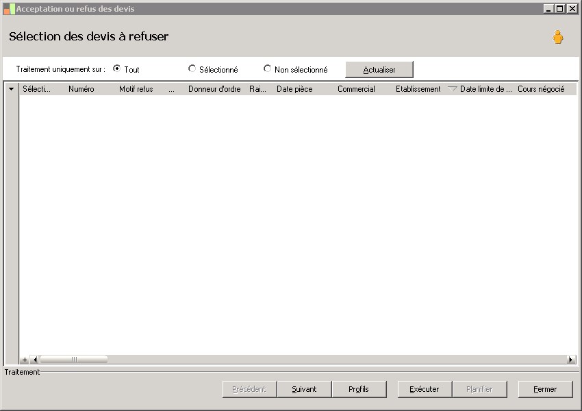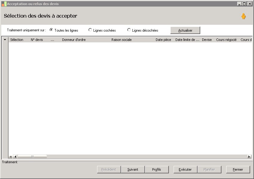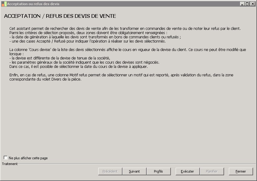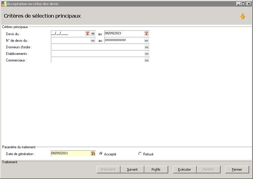 (Sage FRP 1000 Suite Financière) Menu Processus Opérationnels > Ventes > Devis > Acceptation ou refus des devis
