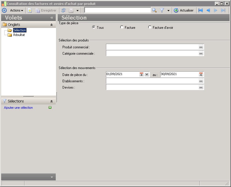 (Sage FRP 1000 Suite Financière) Menu Processus Opérationnels > Achats > Facturation > Consultation des factures et avoirs d'achat par produit