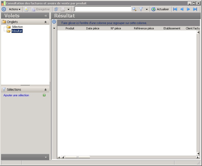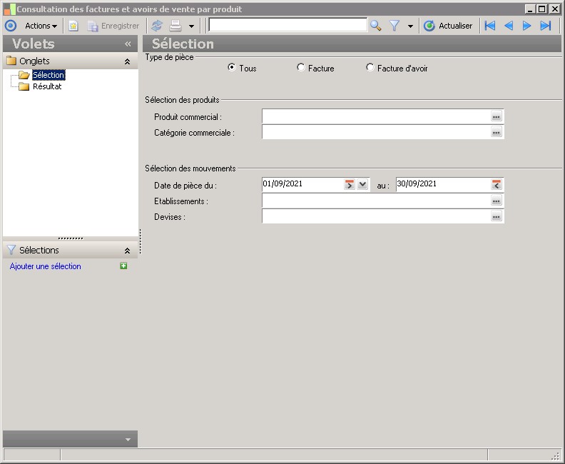 (Sage FRP 1000 Suite Financière) Menu Processus Opérationnels > Ventes > Facturation > Consultation des factures et avoirs de vente par produit