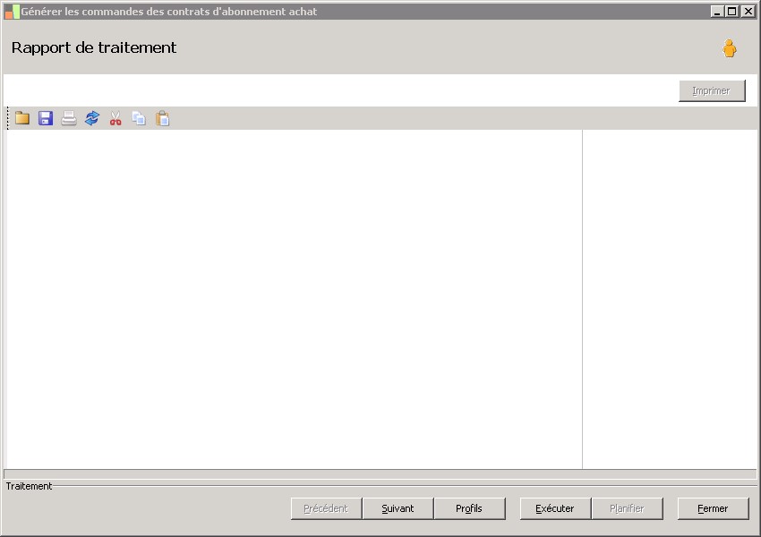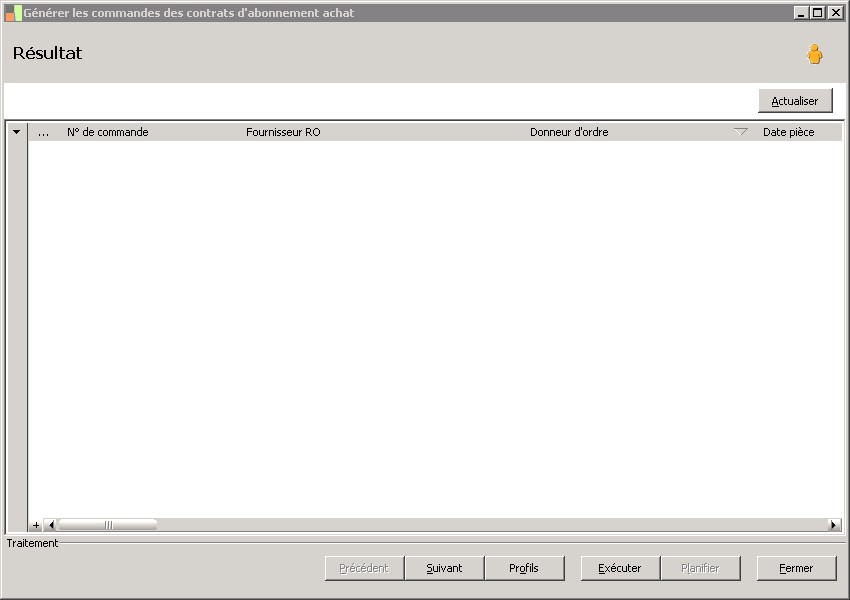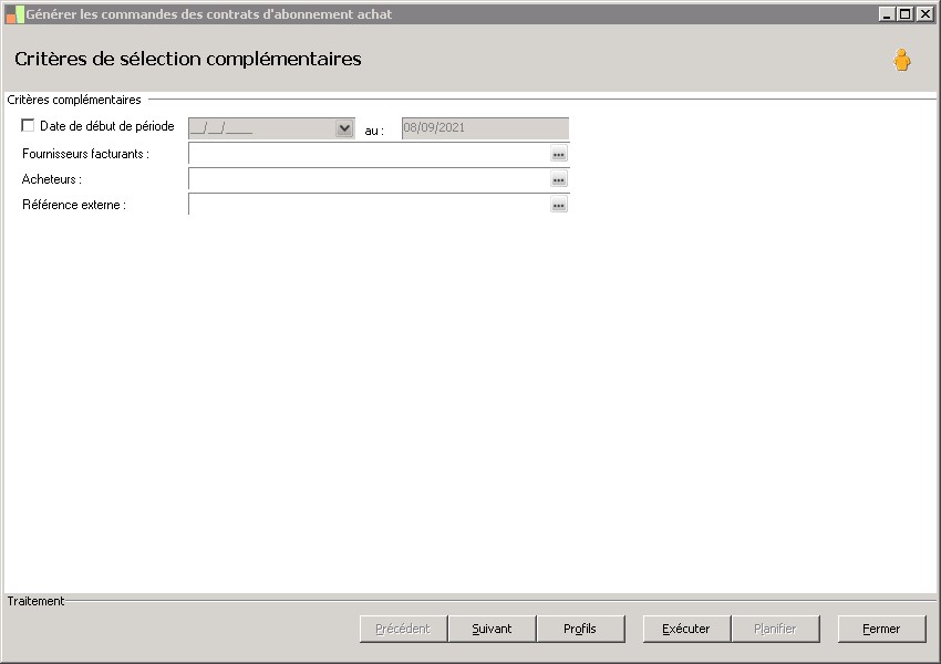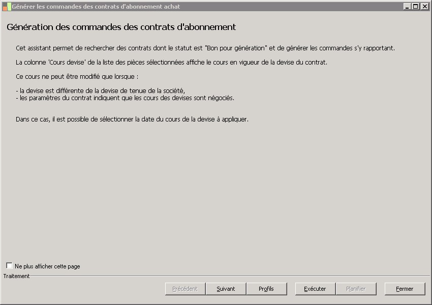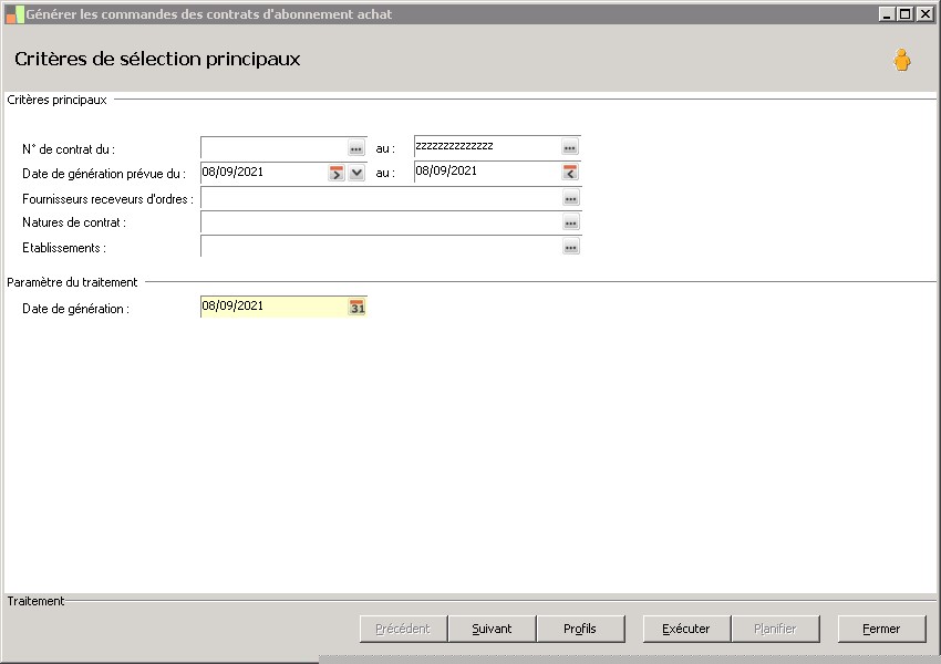 (Sage FRP 1000 Suite Financière) Menu Processus Opérationnels > Achats > Contrats d'abonnement > Générer les commandes des contrats d'abonnement achat