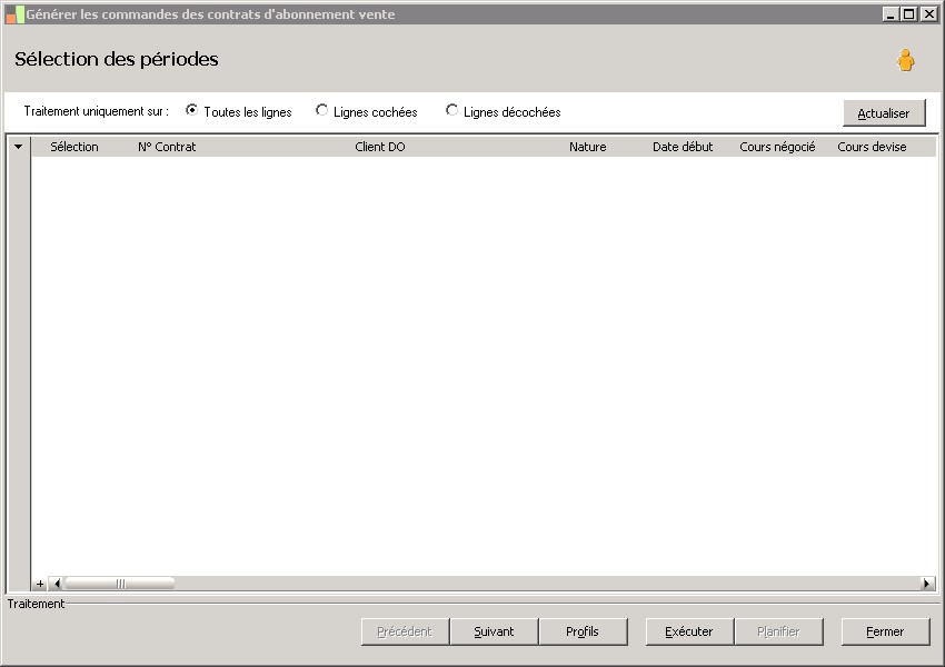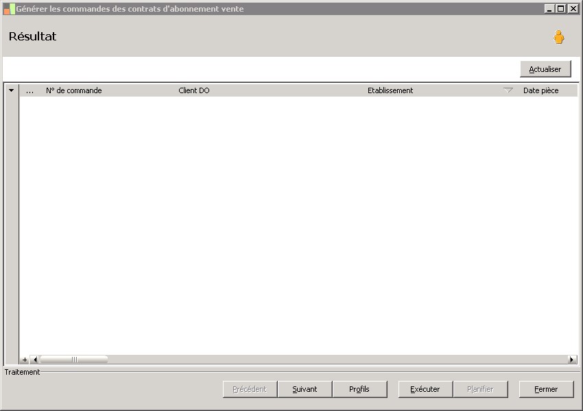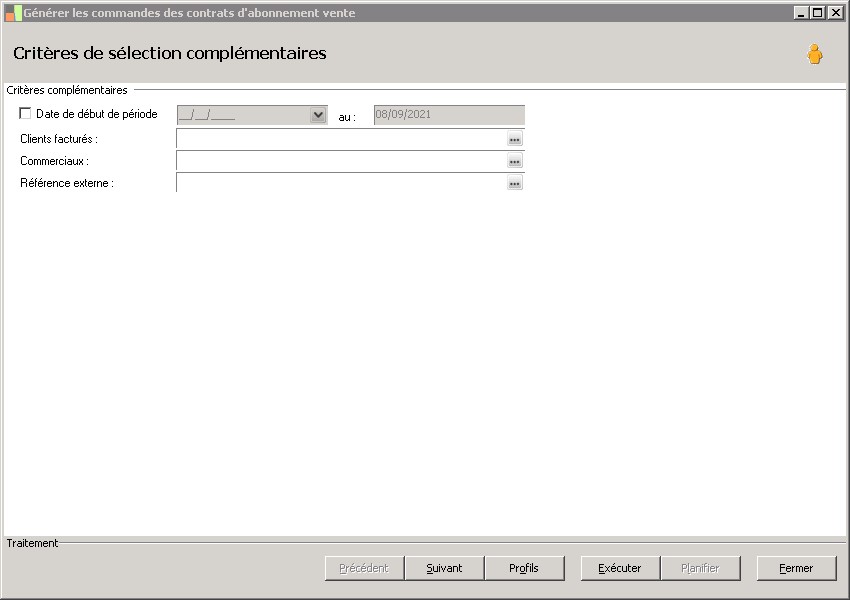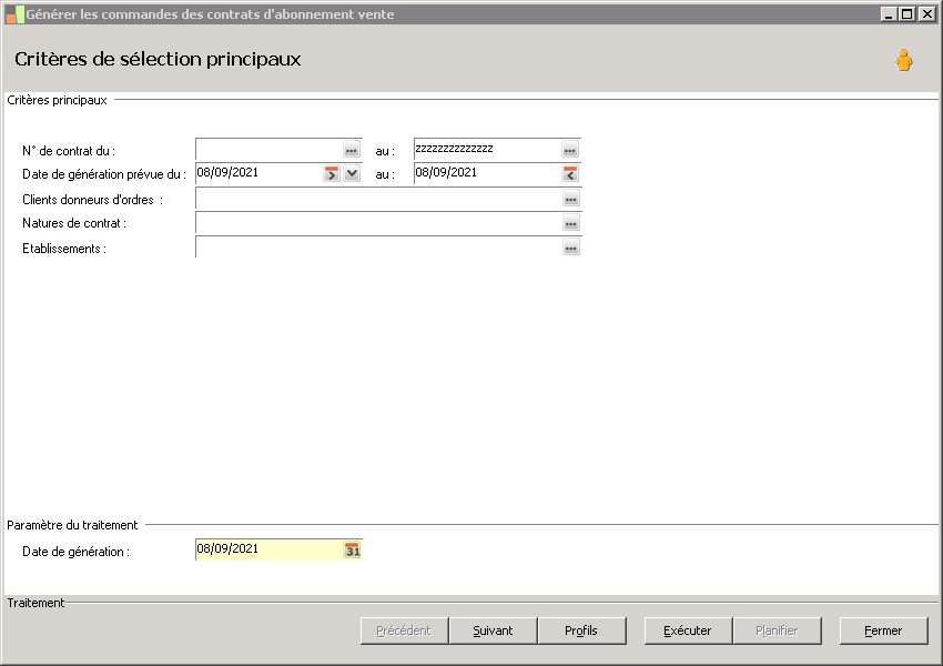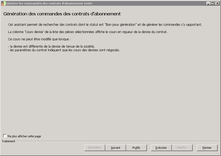 (Sage FRP 1000 Suite Financière) Menu Processus Opérationnels > Ventes > Contrats d'abonnement > Générer les commandes des contrats d'abonnement vente
