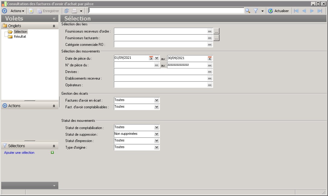 (Sage FRP 1000 Suite Financière) Menu Processus Opérationnels > Achats > Facturation > Consultation des factures d'avoir d'achat par pièce