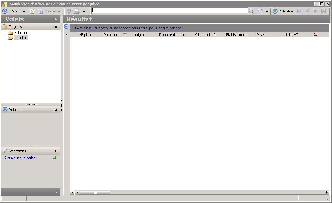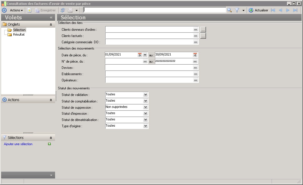 (Sage FRP 1000 Suite Financière) Menu Processus Opérationnels > Ventes > Facturation > Consultation des factures d'avoir de vente par pièce