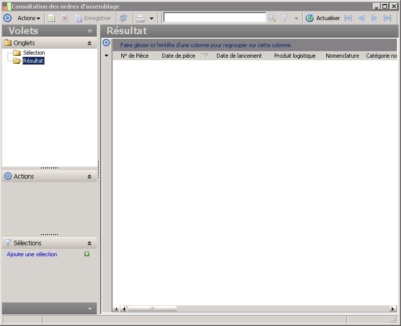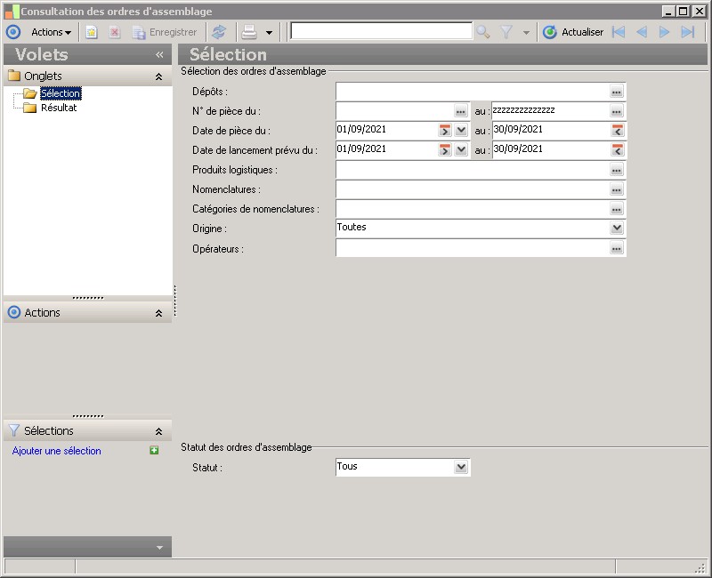 (Sage FRP 1000 Suite Financière) Menu Processus Opérationnels > Stocks > Ordres d'assemblage > Consultation des ordres d'assemblage