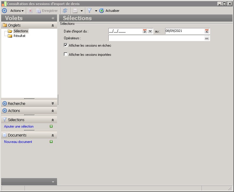 (Sage FRP 1000 Suite Financière) Menu Processus Opérationnels > Initialisation > Import de pièces commerciales > Consultation des sessions d'import de devis