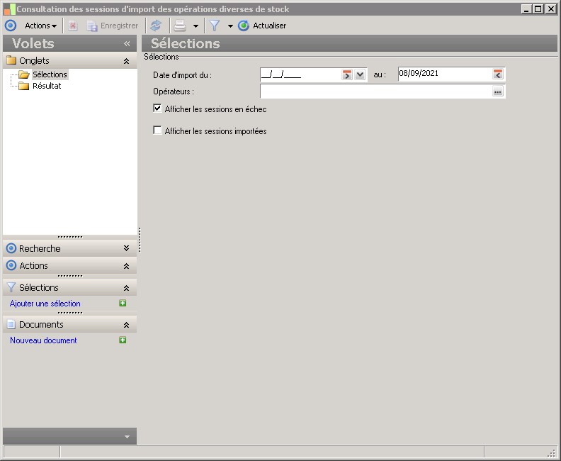 (Sage FRP 1000 Suite Financière) Menu Processus Opérationnels > Initialisation > Import de pièces de stock > Consultation des sessions d'import des opérations diverses de stock
