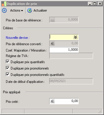 Permet de sélectionner la devise d'expression du nouveau prix créé. |