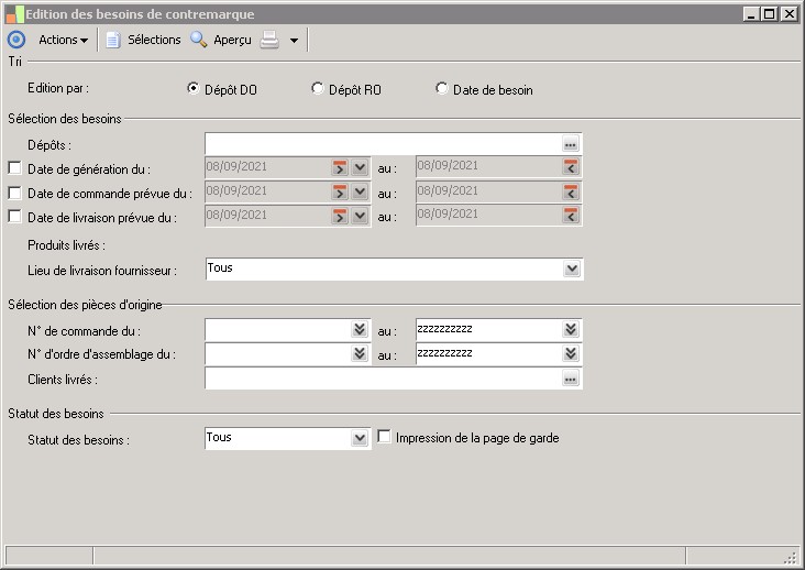 Il est également possible de restreindre l'édition afin d'imprimer les besoins en fonction de leur statut de traitement et du fait qu'elles soient livrables ou pas.