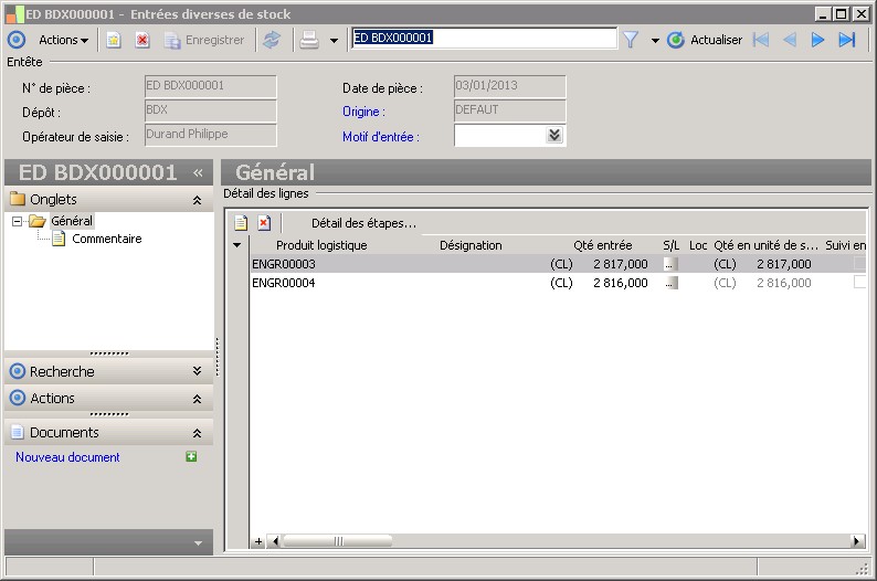 (Sage FRP 1000 Suite Financière) Menu Processus Opérationnels > Stocks > Opérations diverses > Entrées diverses de stock