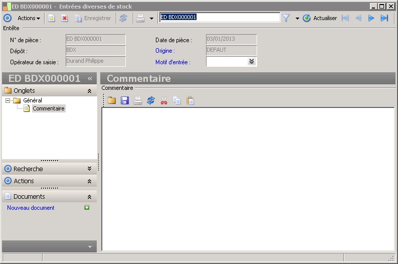 Cette zone permet d'enregistrer un commentaire pour la pièce d'entrée ou de sortie de stock. |