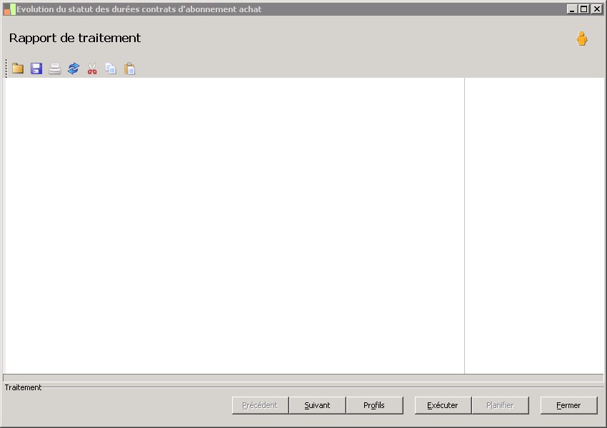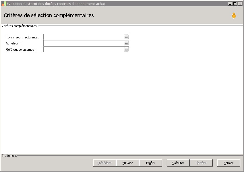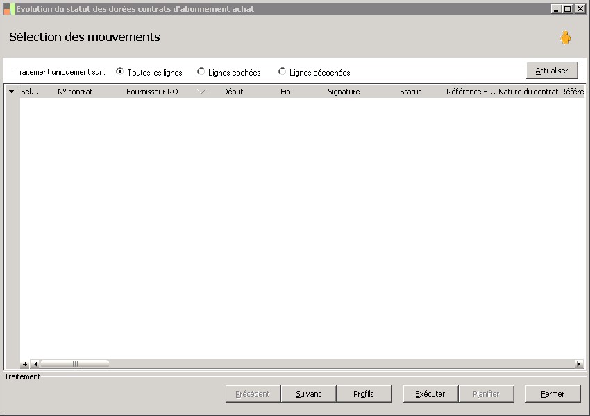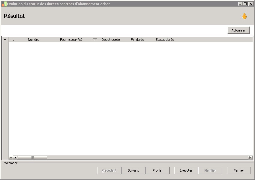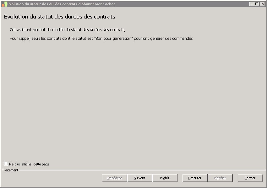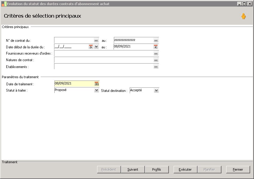 (Sage FRP 1000 Suite Financière) Menu Processus Opérationnels > Achats > Contrats d'abonnement > Evolution du statut des durées contrats d'abonnement achat