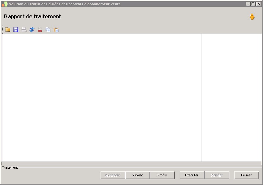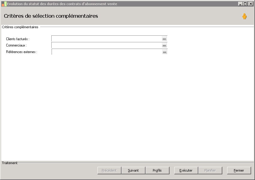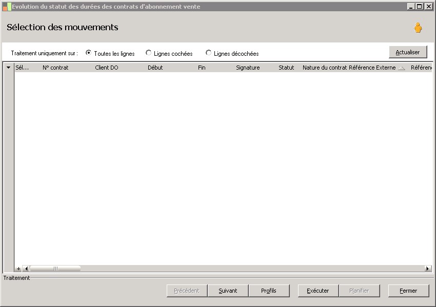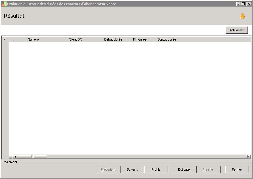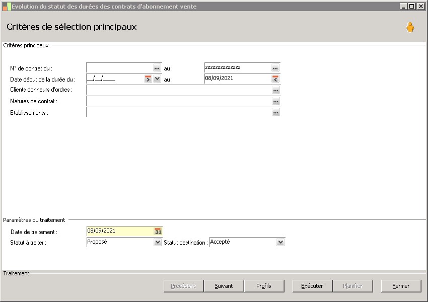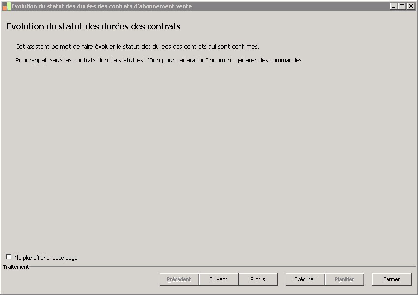 (Sage FRP 1000 Suite Financière) Menu Processus Opérationnels > Ventes > Contrats d'abonnement > Evolution du statut des durées des contrats d'abonnement vente
