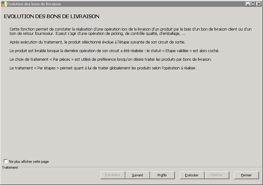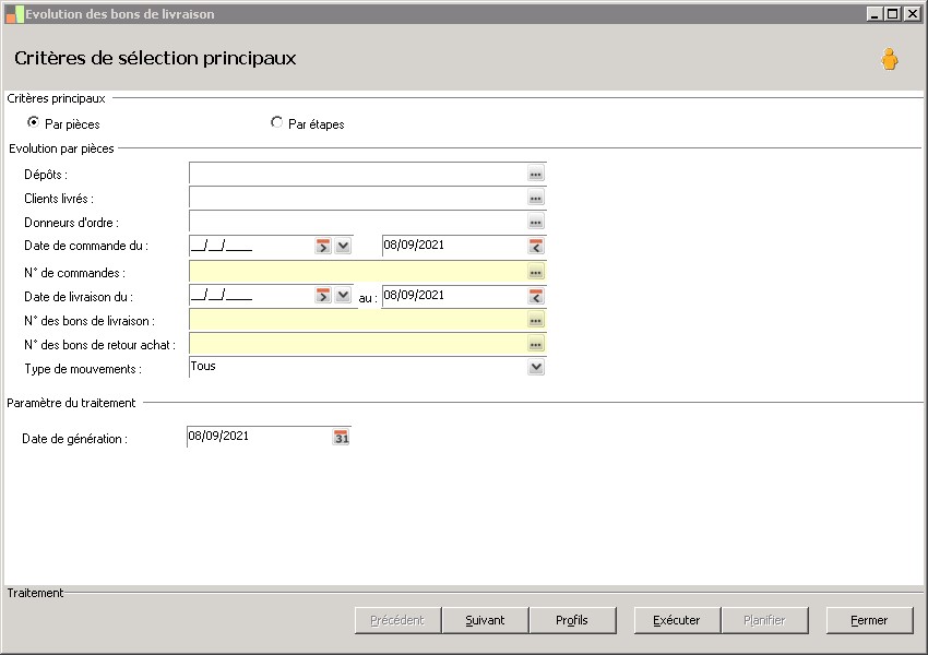 - Par pièces : cette possibilité sera utilisée de préférence lorsqu'on désire traiter globalement les bons de livraison. Les mouvements évoluent à l'étape suivante du circuit de livraison des produits. A l'issue du traitement, les mouvements ne sont donc pas tous nécessairement sur la même étape car le circuit de livraison peut varier d'un produit à un autre.