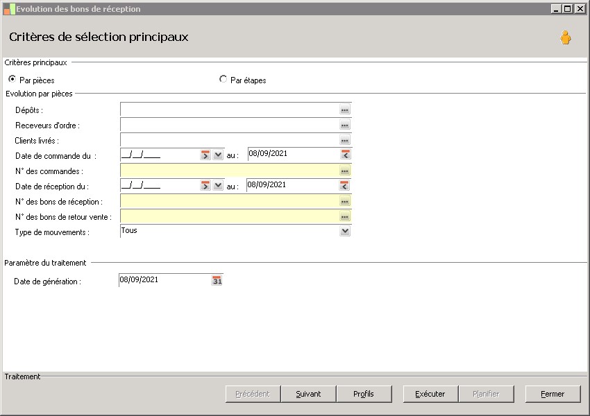 - Par pièces : cette possibilité sera utilisée de préférence lorsqu'on désire traiter globalement les bons de réception. Les mouvements évoluent à l'étape suivante du circuit de réception des produits. A l'issue du traitement, les mouvements ne sont donc pas tous nécessairement sur la même étape car le circuit de réception peut varier d'un produit à un autre.