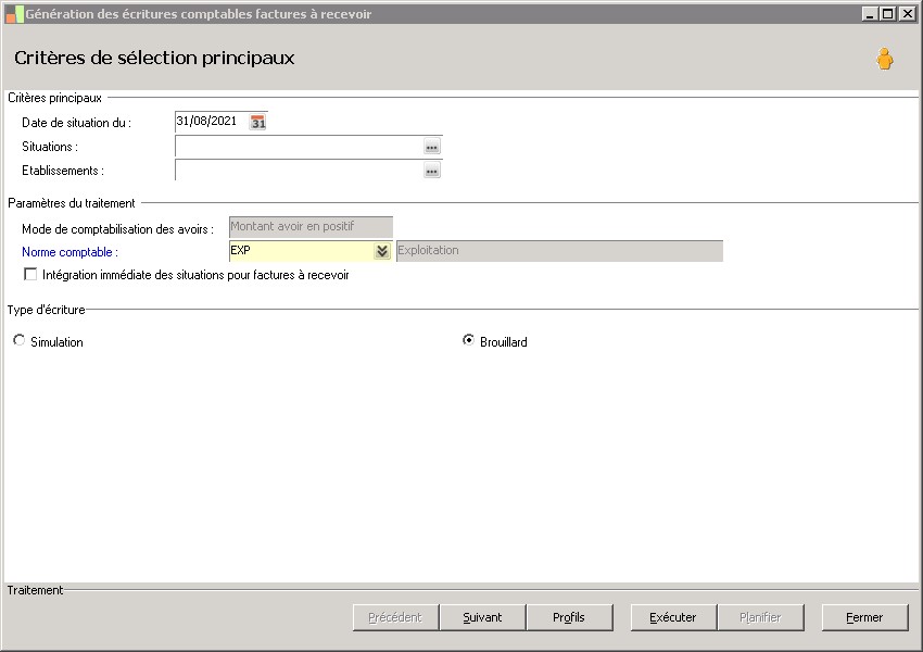 (Sage FRP 1000 Suite Financière) Menu Processus Opérationnels > Achats > Situations comptables périodiques > Génération des écritures comptables factures à recevoir