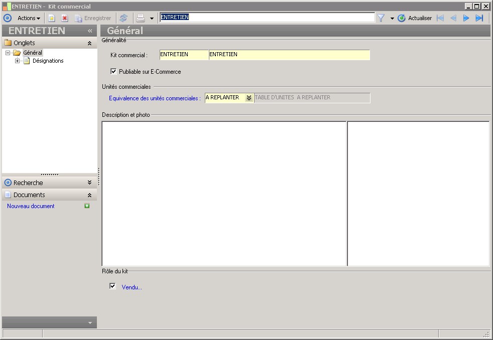 (Sage FRP 1000 Suite Financière) Menu Processus Opérationnels > Fichiers de base > Kits > Kit commercial