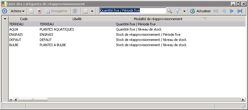 (Sage FRP 1000 Suite Financière) Menu Processus Opérationnels > Paramètres > Produits > Liste des catégories de réapprovisionnement