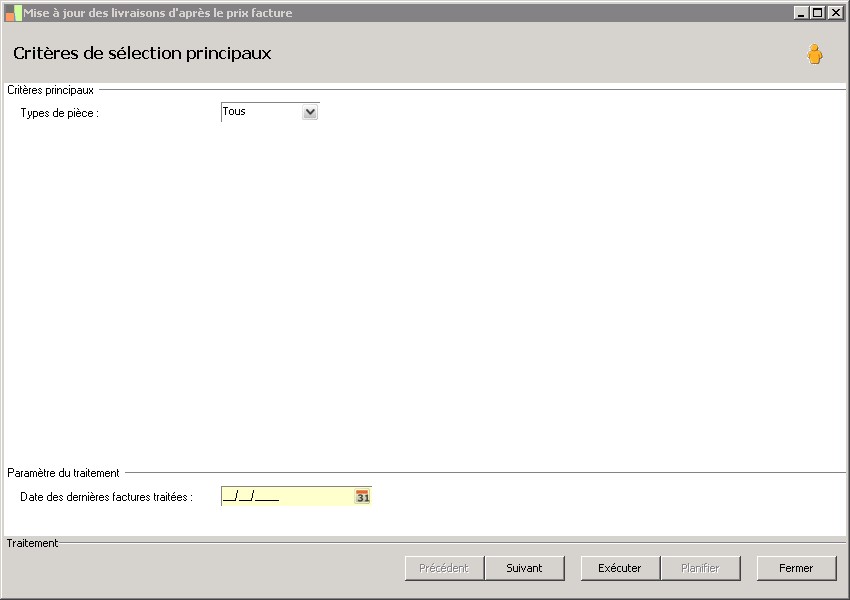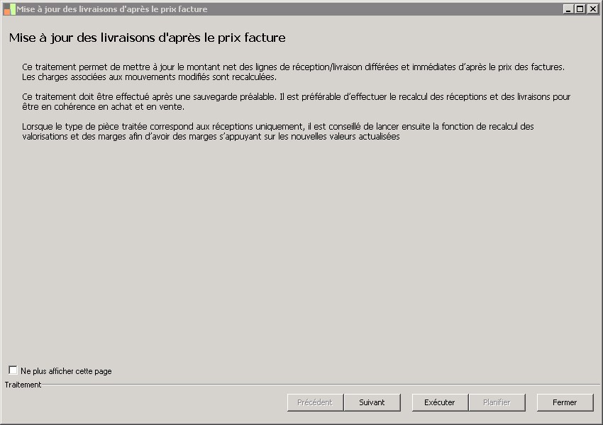 Cet assistant permet de mettre à jour le montant net des lignes de réception (en achat), ou de livraison (en vente), différées et immédiates d'après le prix des factures.