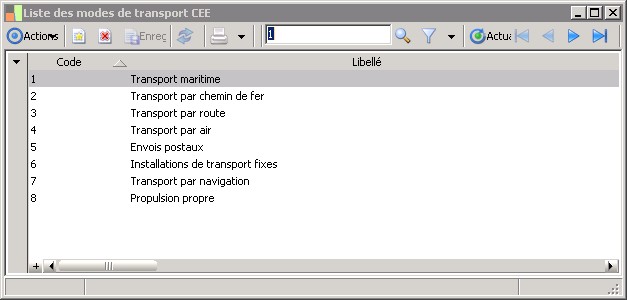 (Sage FRP 1000 Suite Financière) Menu Processus Opérationnels > Paramètres > Généraux > DEB > Liste des modes de transport CEE