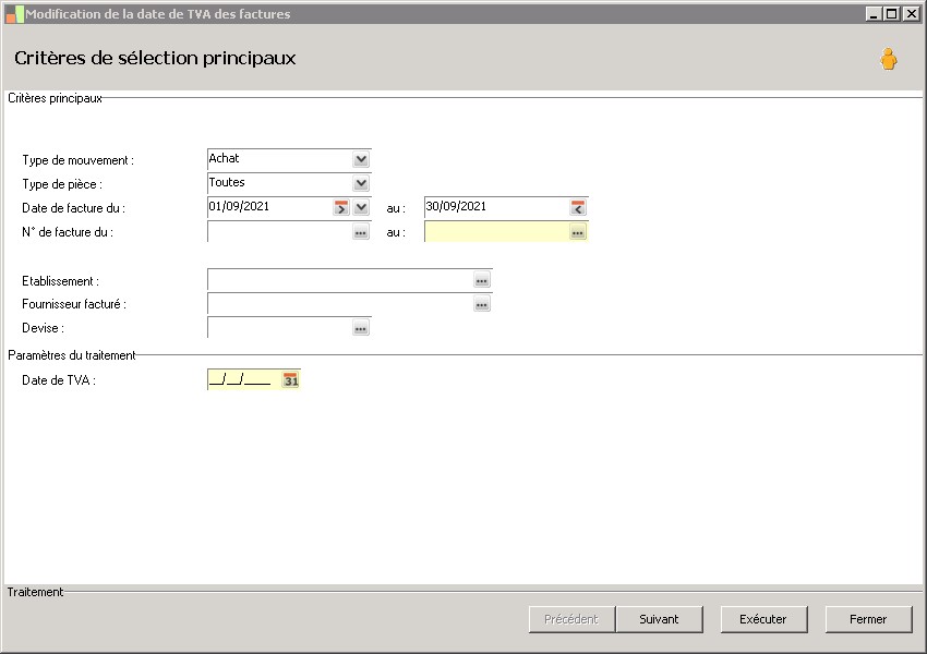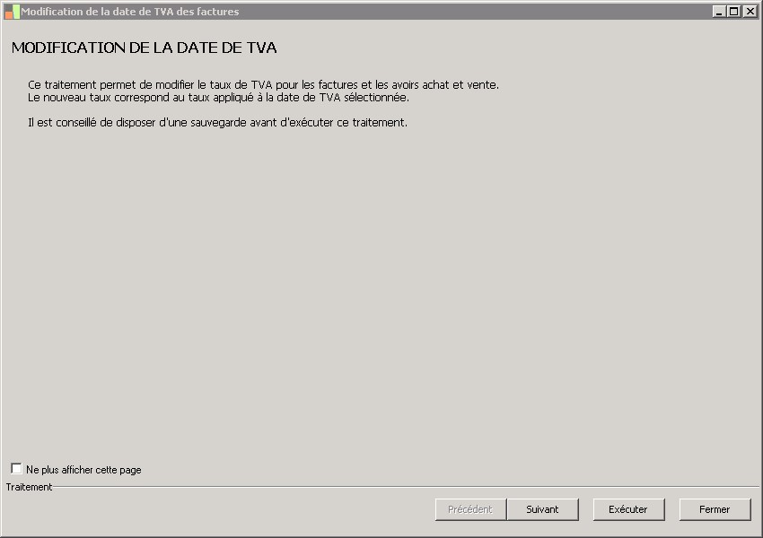 (Sage FRP 1000 Suite Financière) Menu Processus Opérationnels > Initialisation > Facturation > Modification de la date de TVA des factures