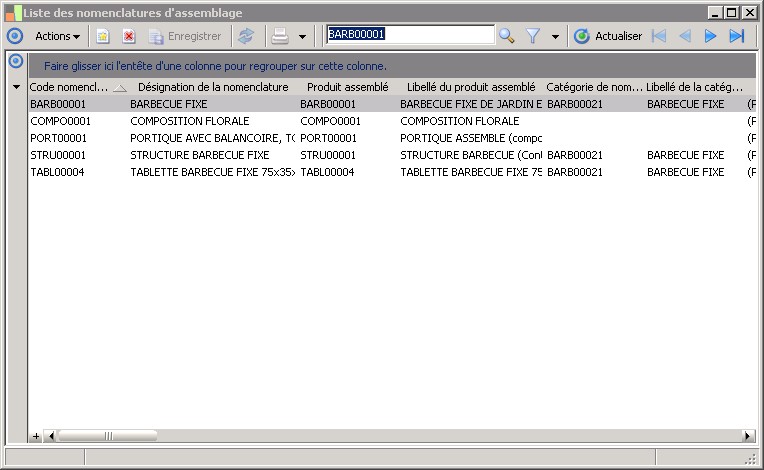 Cette liste présente les nomenclatures d'assemblage et permet de créer, de consulter, de modifier ou de supprimer leur fiche. Elle est lancée par la fonction