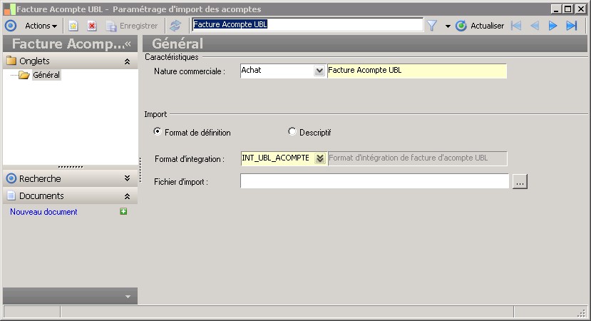 (Sage FRP 1000 Suite Financière) Menu Processus Opérationnels > Initialisation > Import de pièces commerciales > Paramétrage d'import des acomptes