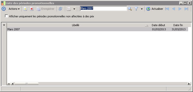 Afficher uniquement les périodes promotionnelles non affectées à des prix vous permet d'afficher les périodes promotionnelles qui ne sont pas utilisées.