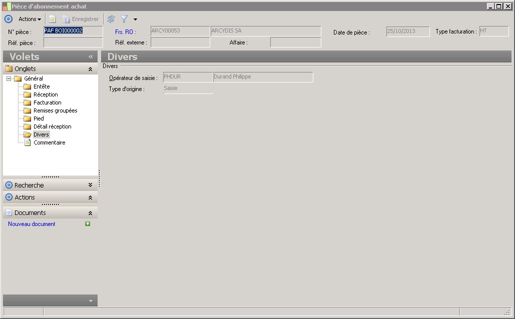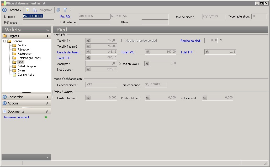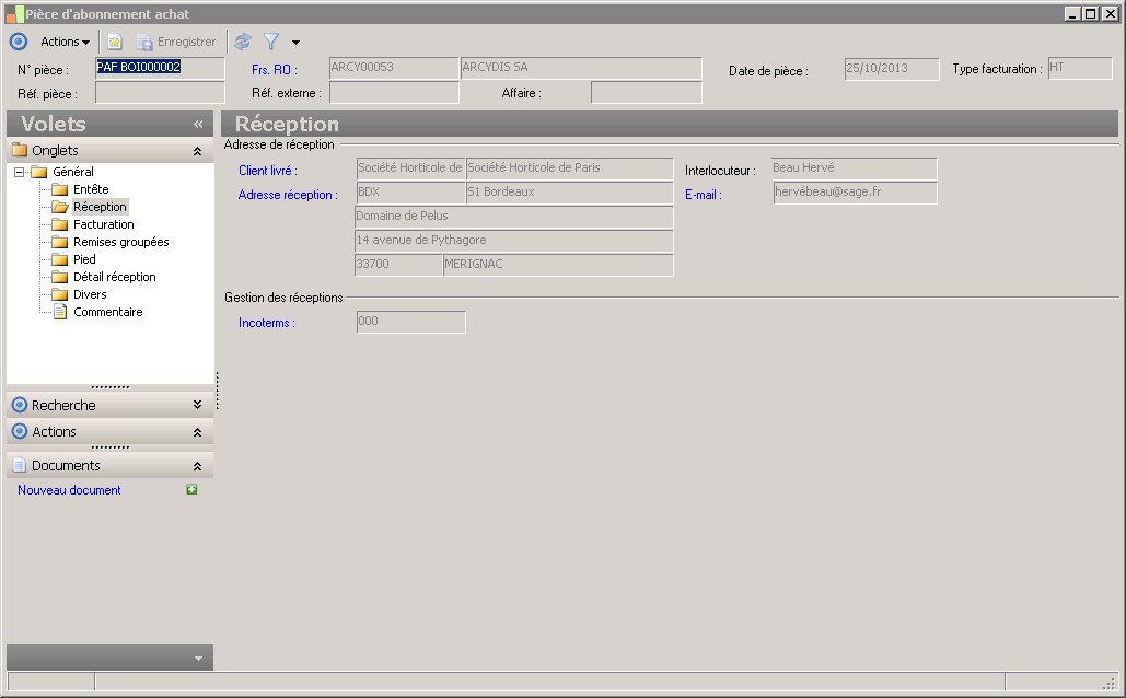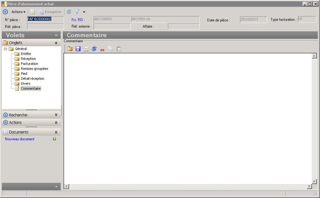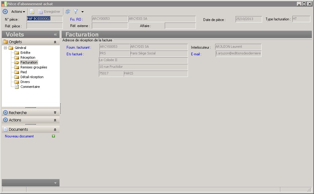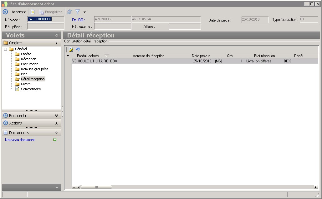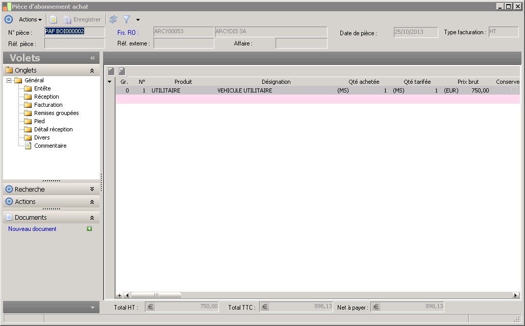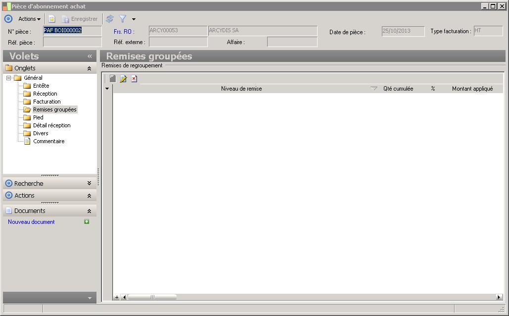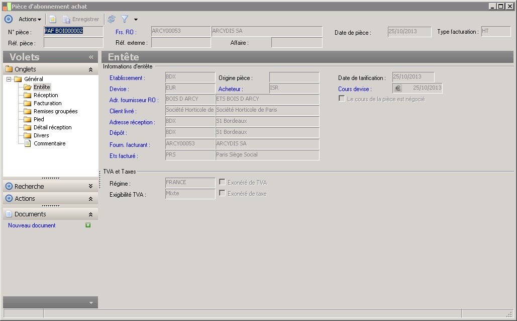 (Sage FRP 1000 Suite Financière) Menu Processus Opérationnels > Achats > Contrats d'abonnement > Pièce d'abonnement achat