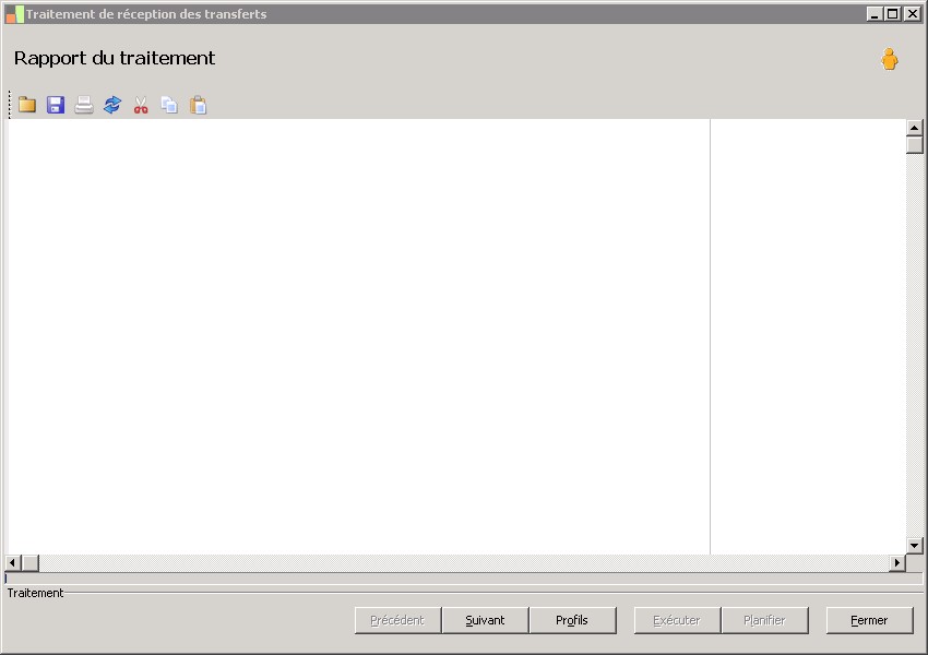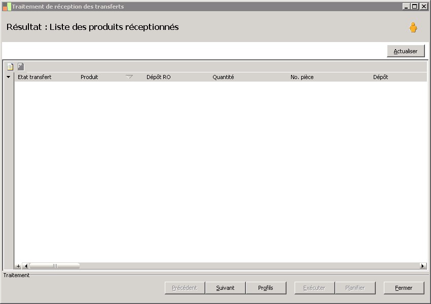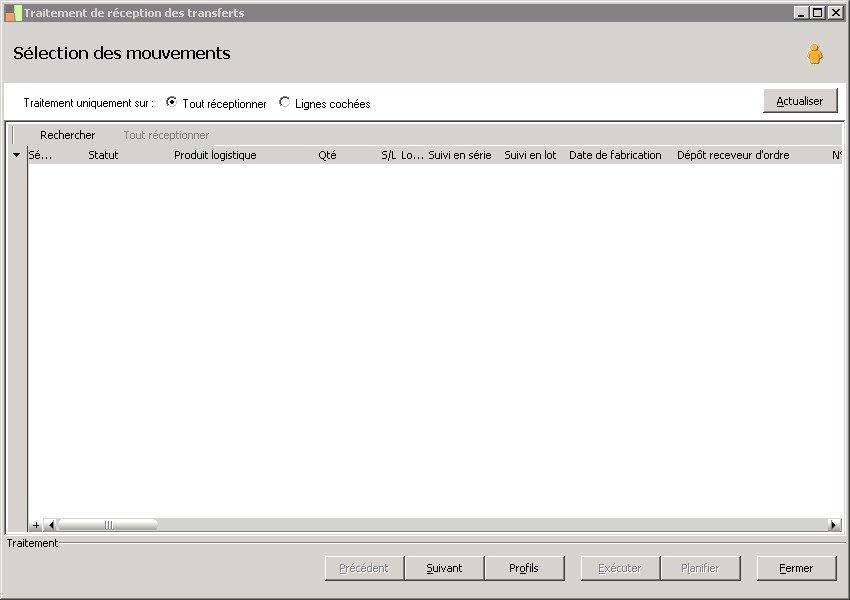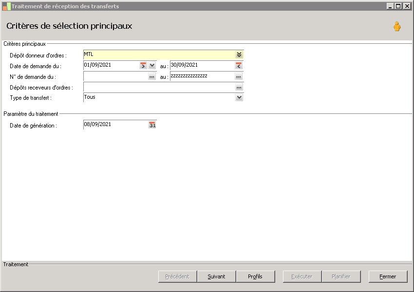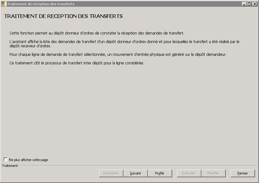 (Sage FRP 1000 Suite Financière) Menu Processus Opérationnels > Stocks > Transferts inter/intra-dépôt(s) > Traitement de réception des transferts