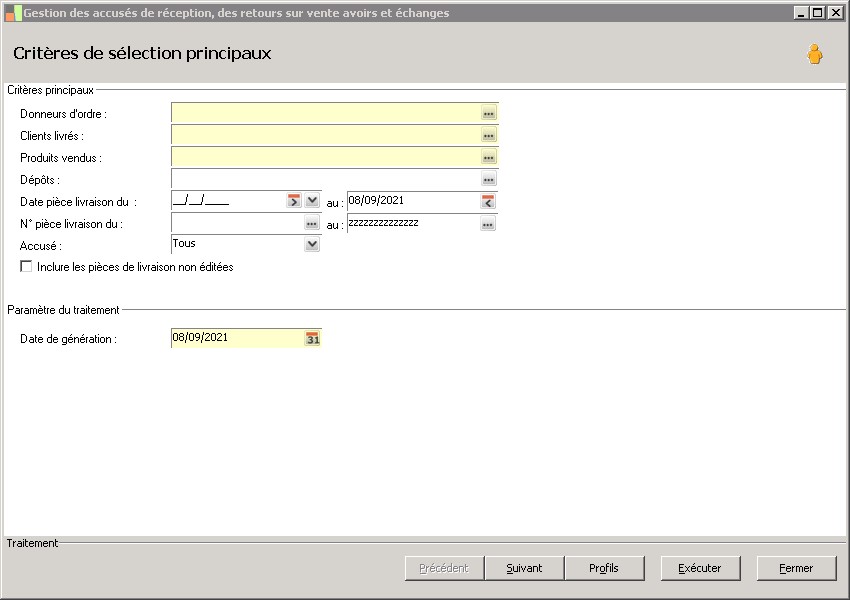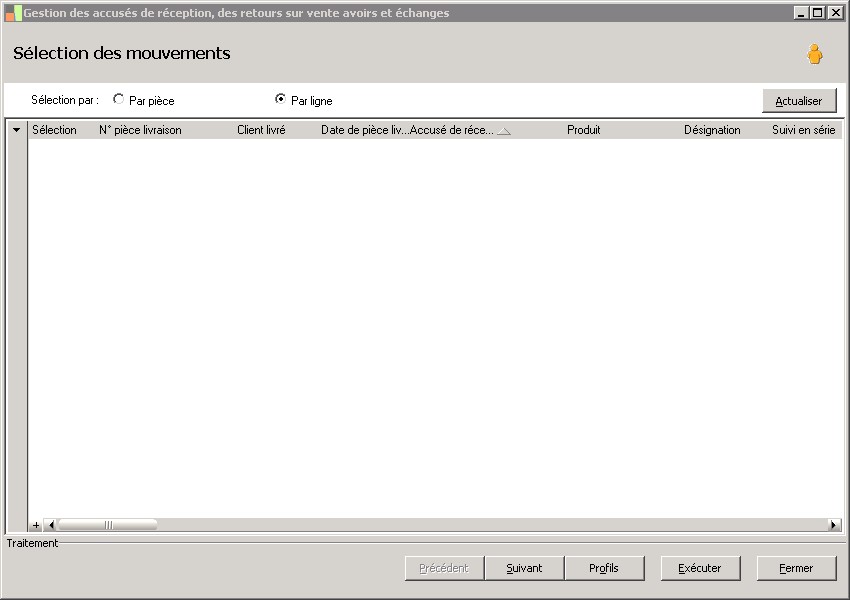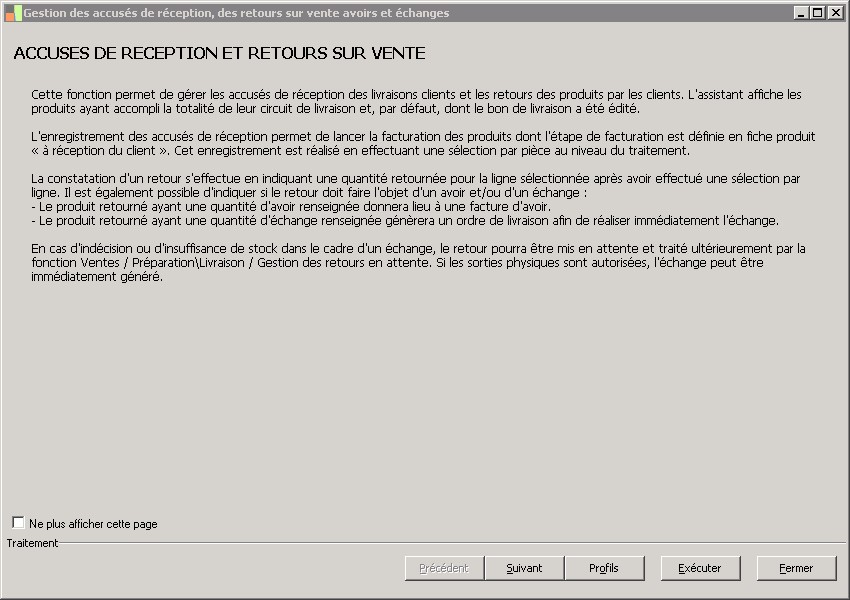 Cette fonction permet d'une part de gérer les accusés de réception des livraisons clients et d'autre part de gérer les articles retournés par les clients et de générer les pièces correspondantes. Elle est lancée à partir de la fonction