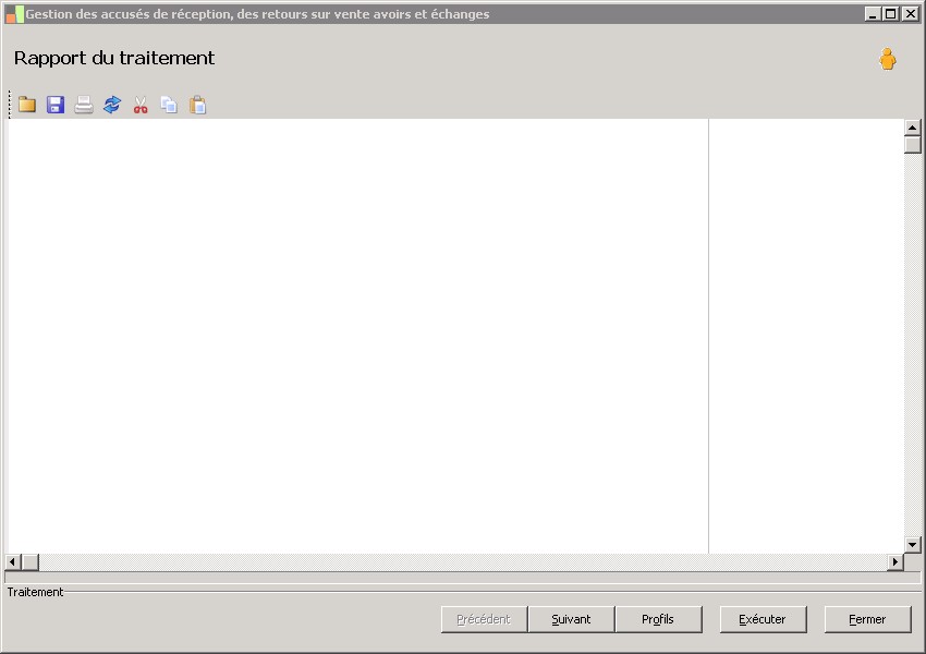 Cette fenêtre apparaît automatiquement après l'exécution de la fonction. Elle affiche les opérations conduites par le programme et, éventuellement, les anomalies constatées. Dans ce cas, il est nécessaire de corriger ces anomalies et de relancer le processus pour générer le bon de retour si sa référence n'apparaît pas dans cette zone.