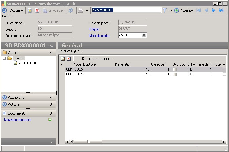 Le détail des opérations diverses permet d'enregistrer l'ensemble des lignes articles des entrées et des sorties d'articles suivis en stock, en dehors des processus d'achat et de vente. |