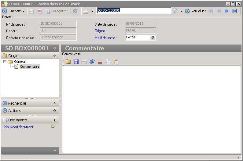 Cette zone permet d'enregistrer un commentaire pour la pièce d'entrée ou de sortie de stock. |
