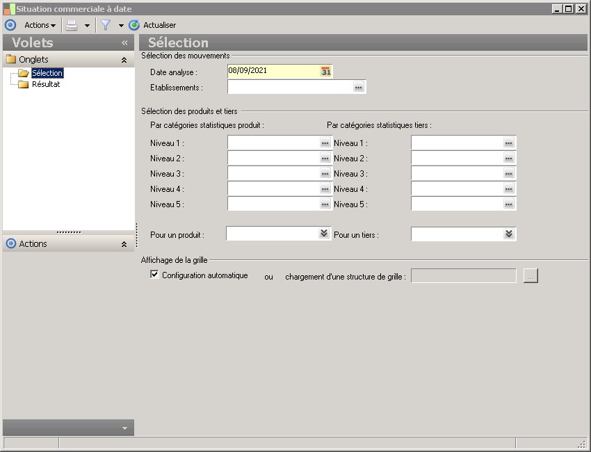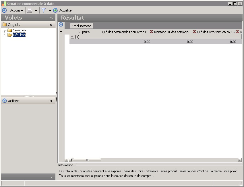 - Résultat : ce dossieraffiche les résultats obtenus en fonction des critères de sélection enregistrés dans le volet Sélection et après action sur le bouton Actualiser la liste ou sur la commande Actualiser du menu Actions .