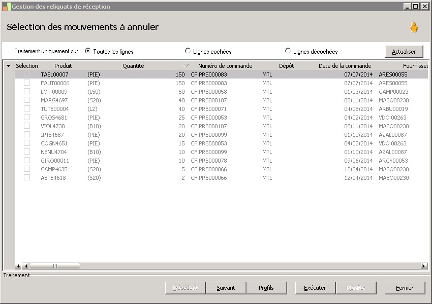 Cette fonction permet de supprimer les lignes de pièce concernant des articles en reliquat. Elle est lancée à partir de la fonction